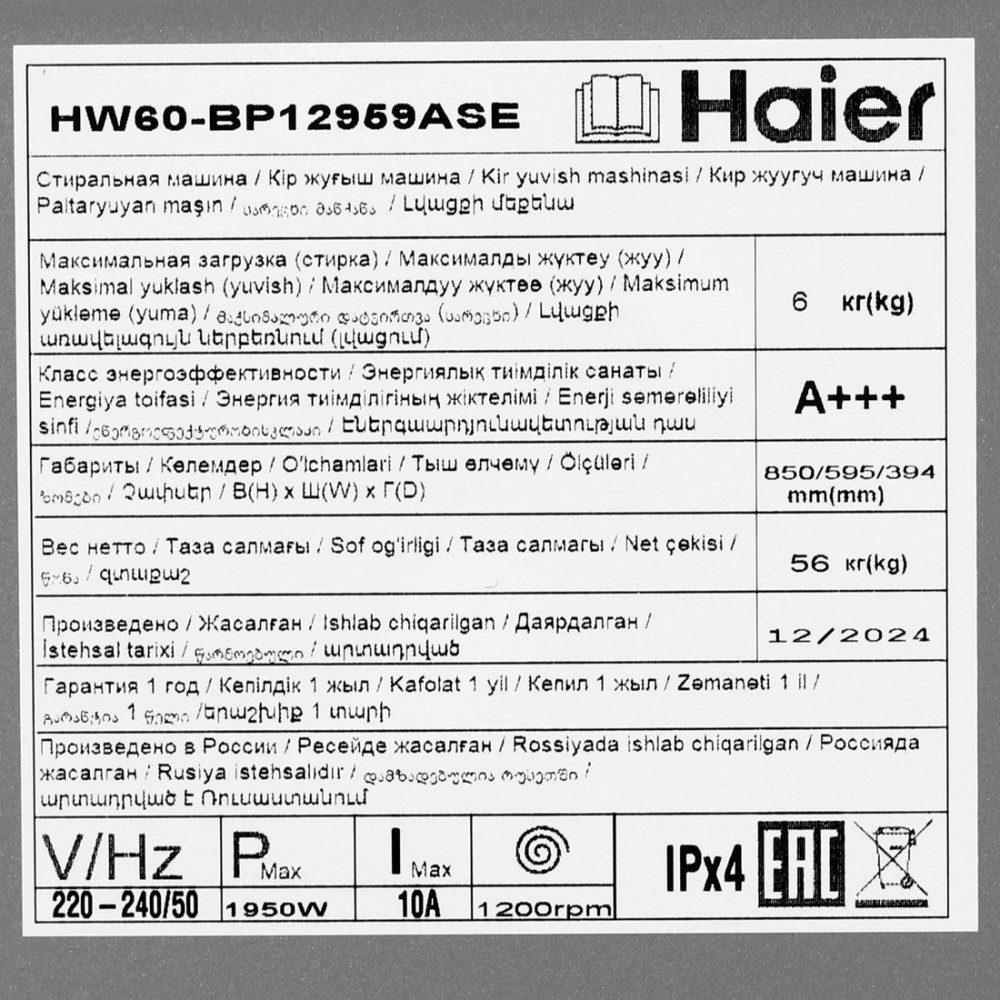 Описание Стиральная машина HAIER HW60-BP12959ASE