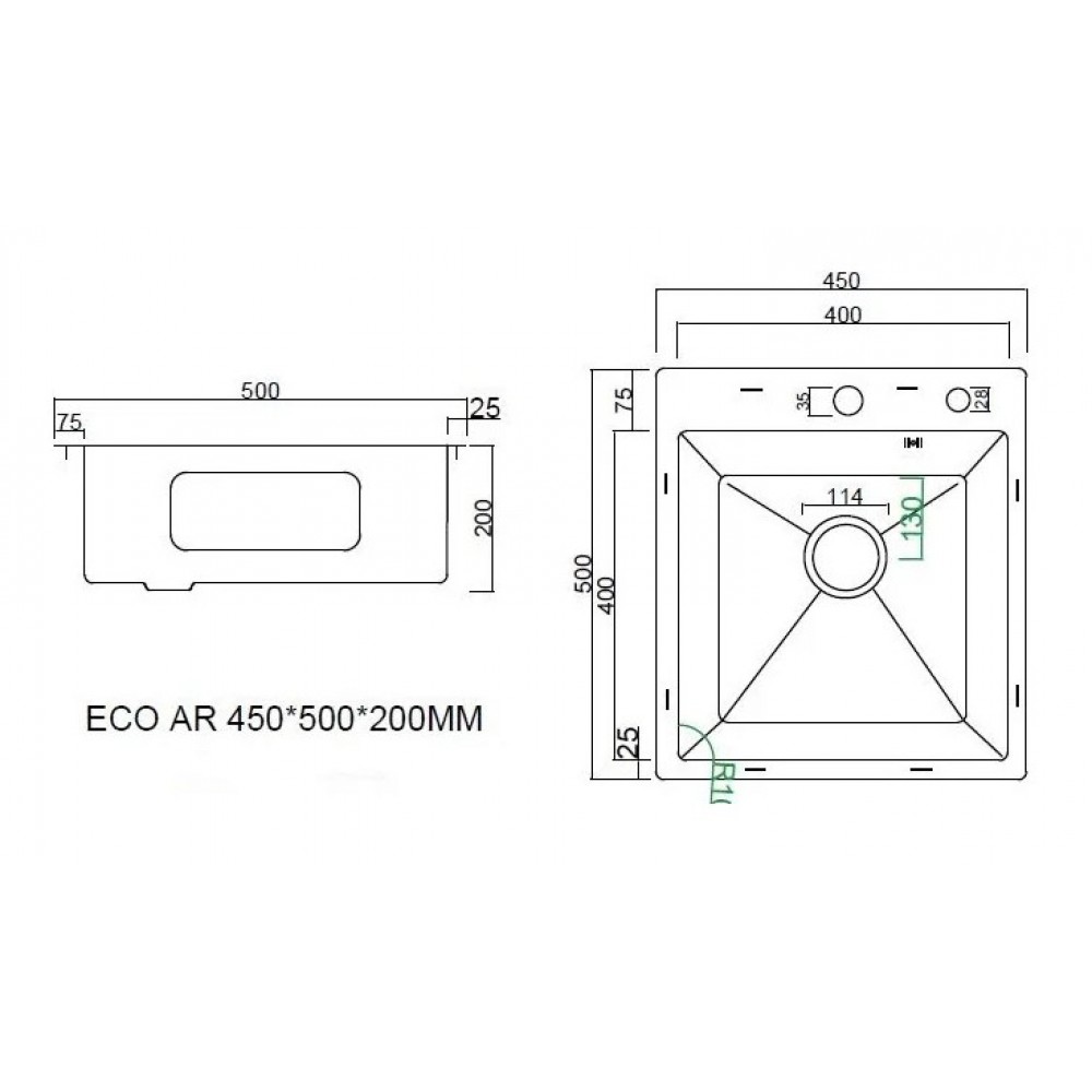 Технические характеристики Кухонная мойка ARFEKA Eco AR мойка 450*500, коландер G, дозатор Black +CL AR G+DS AR