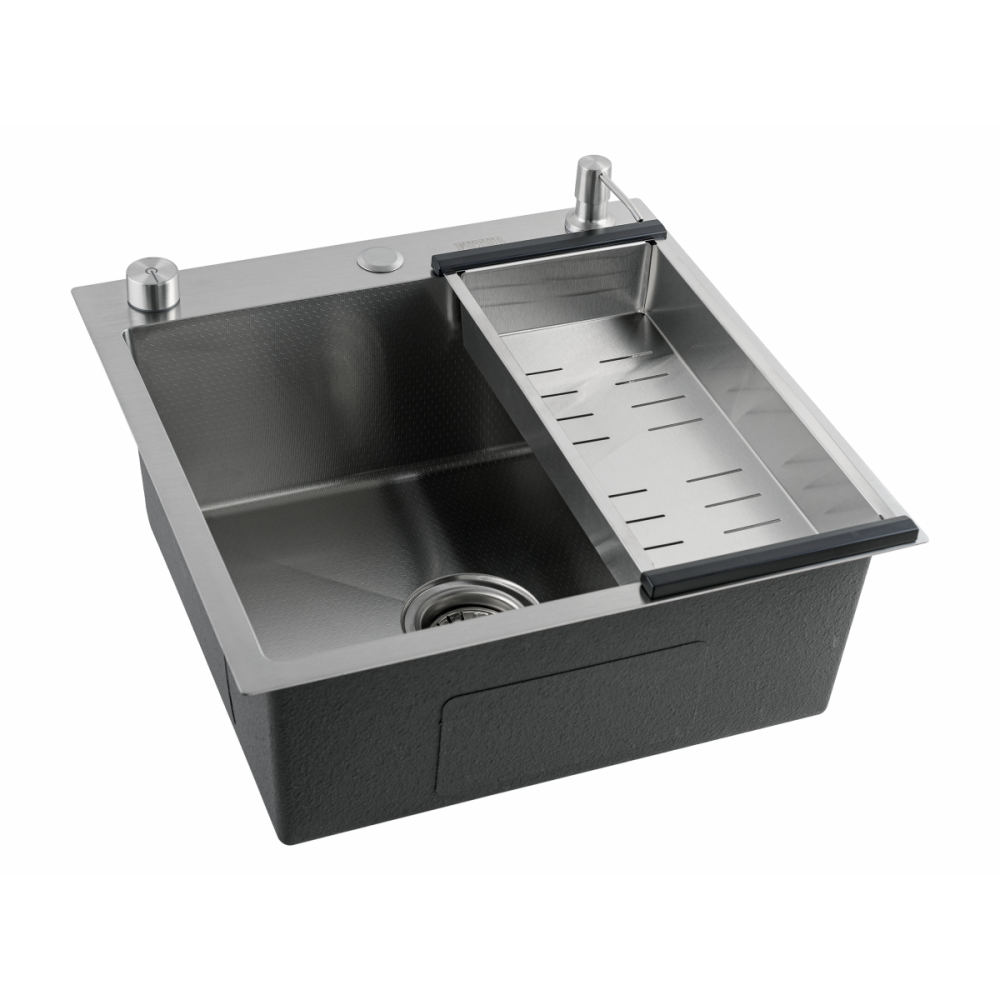 Описание набора: полуавтоматический сифон Pop up, коландер, гофра, дозатор для моющего средства, мойка, смеситель
