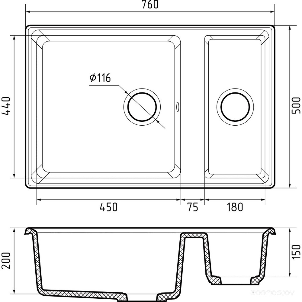 Ширина мойки: 76 см