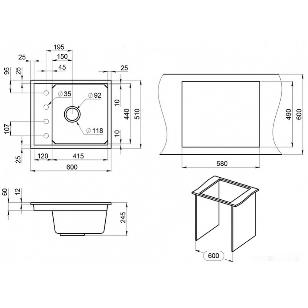 Ширина мойки: 60 см