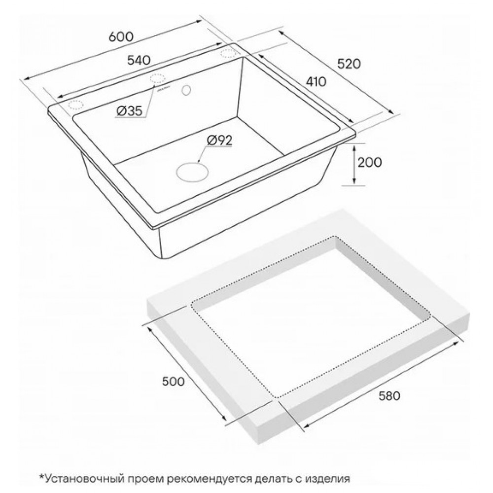 | Установканад столешницей | Формапрямоугольная |