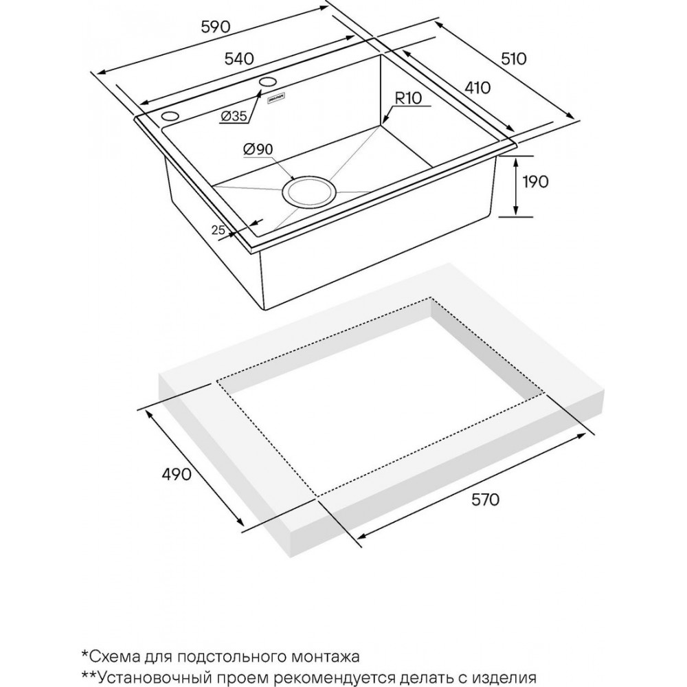 | Установканад столешницей | Формапрямоугольная |