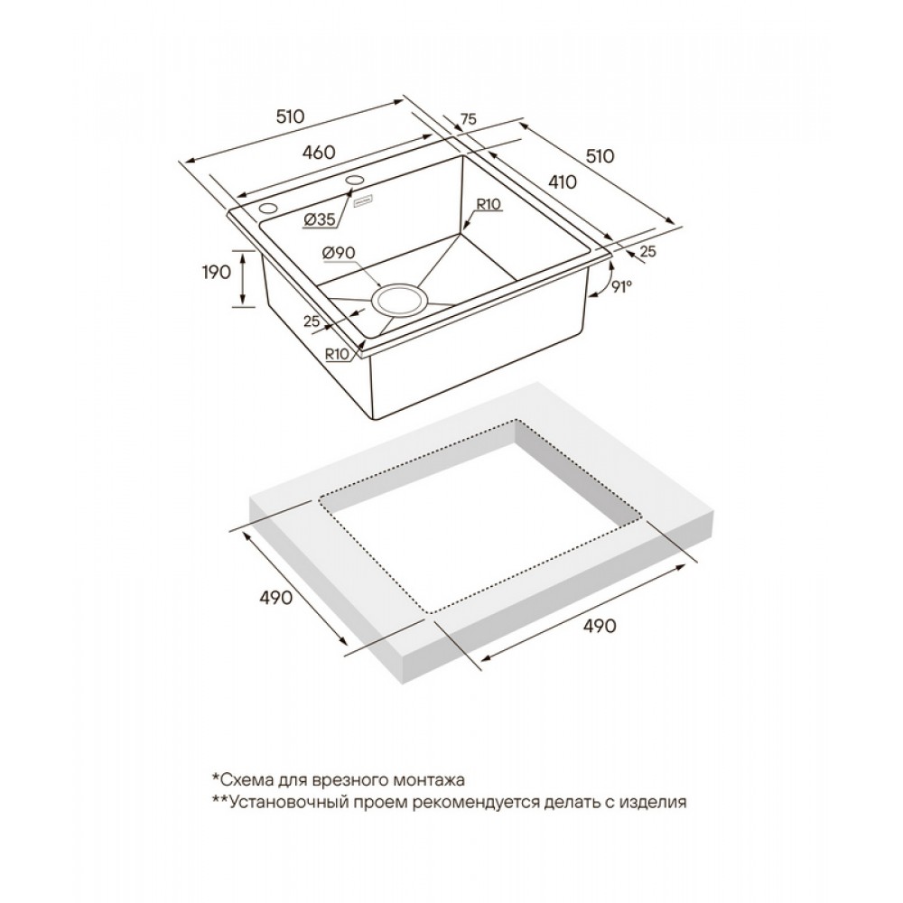 | Установканад столешницей | Формапрямоугольная |