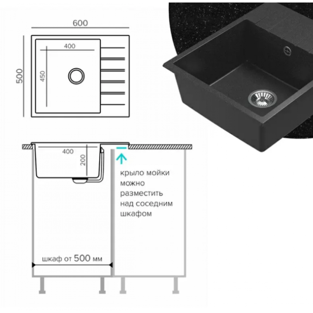 Технические характеристики Кухонная мойка Polygran Deka 600 (черный)