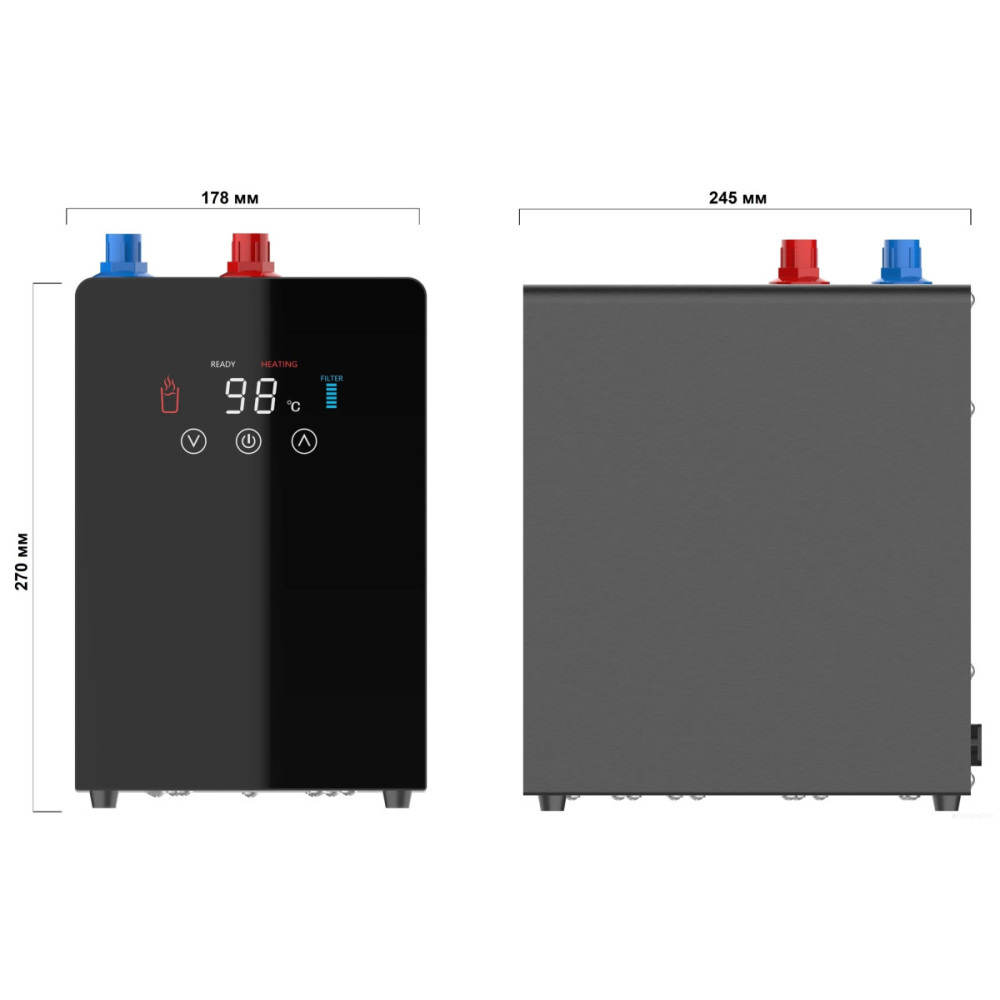 Комплектация: Смеситель 2 в 1; Бойлер (2,4 или 4 л); Система фильтрации; Соединительные шланги; Монтажный комплект.