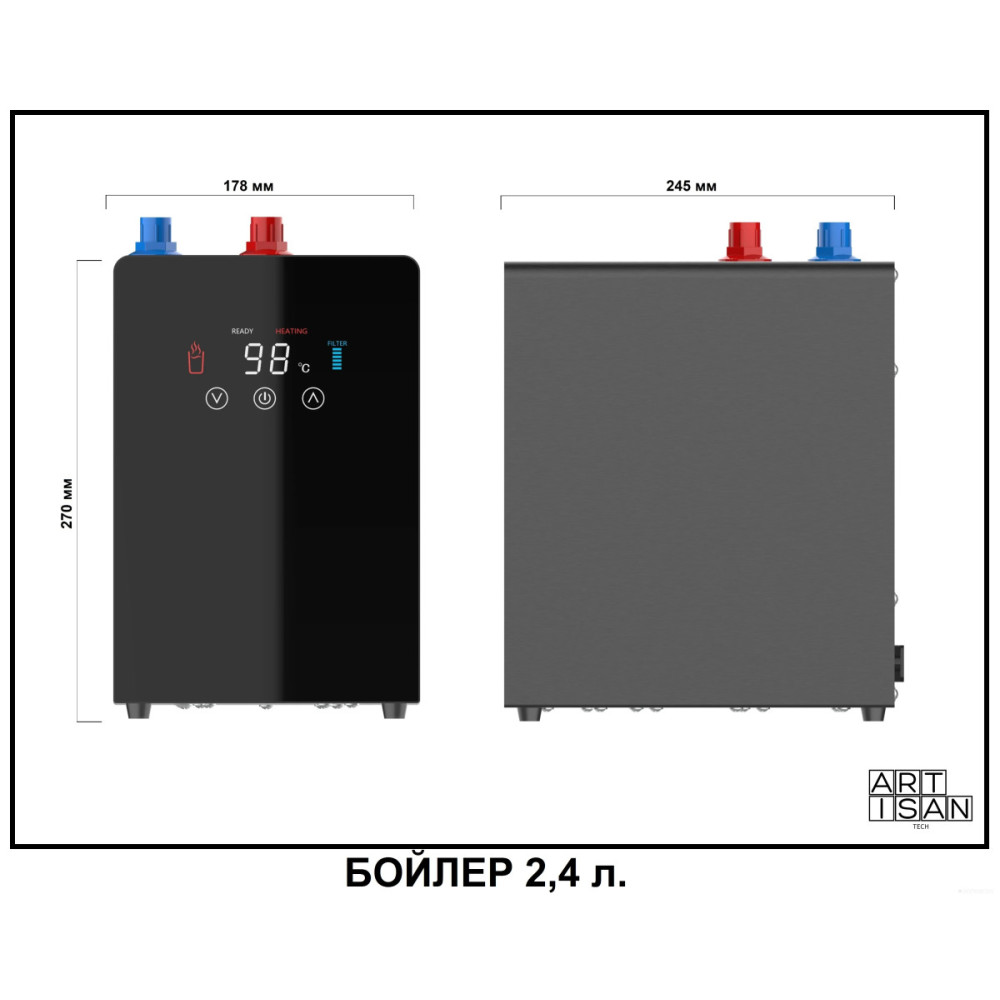 | Комплектация | Смеситель 5 в 1; Бойлер (2,4 или 4 л); Система газации; Система фильтрации; Соединительные шланги; Монтажный комплект. |