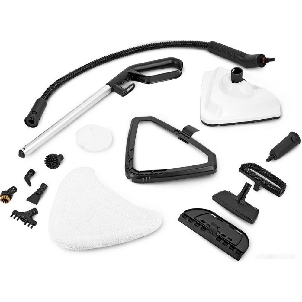 Описание набора: паровая швабра; - удлинительная ручка; - корпус; - ручной модуль; - резервуар для моющего средства; - крышка резервуара для моющего средства с уплотнительным кольцом; - резервуар для воды; - фильтр для смягчения воды с уплотнительным кольцом; - щетка для пола; - тряпка для пола; - рамка для ковра; - паровой шланг с уплотнительным кольцом; - струйная насадка с уплотнительным кольцом; - насадка для отпаривания; - скребок для стекла с резиновой вставкой; - ворсовая щетка; - угловая насадка; - скребок; - круглая нейлоновая щетка; - плоская нейлоновая щетка; - руководство по эксплуатации.