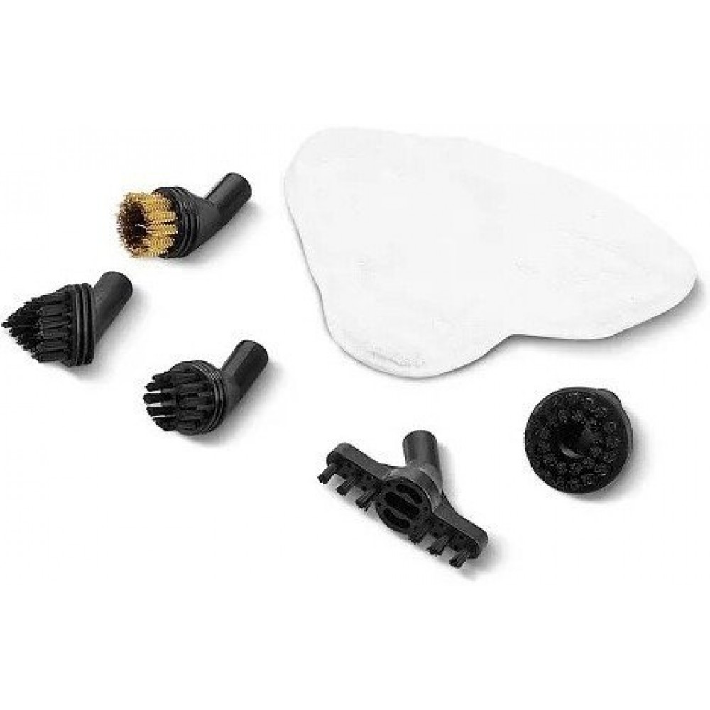 | Описание набора | паровая швабра, удлинительная трубка, рамка для ковра, насадка со скребком, тряпка для отпаривания, тряпка для удаления пыли, струйная насадка, угловая насадка, латунная щётка, нейлоновая щётка, инструкция |
