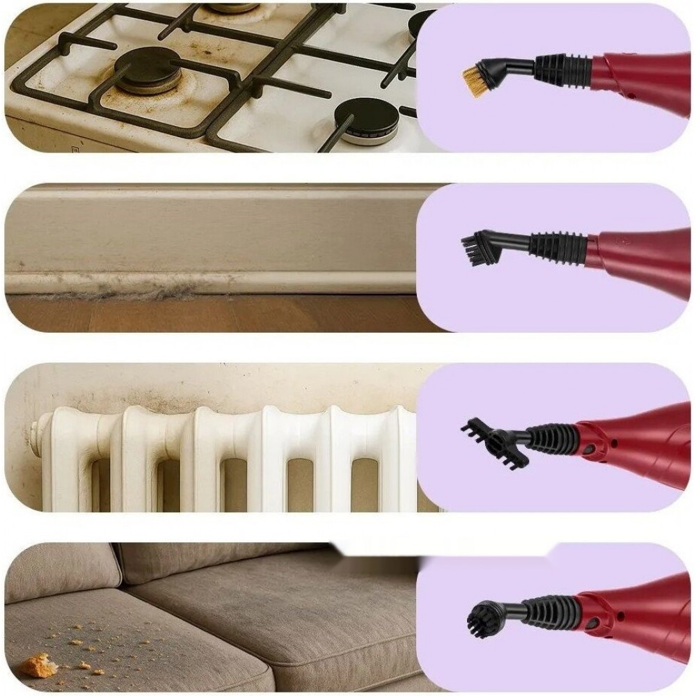 Описание набора: паровая швабра, удлинительная трубка, рамка для ковра, насадка со скребком, тряпка для отпаривания, тряпка для удаления пыли, струйная насадка, угловая насадка, латунная щётка, нейлоновая щётка, инструкция