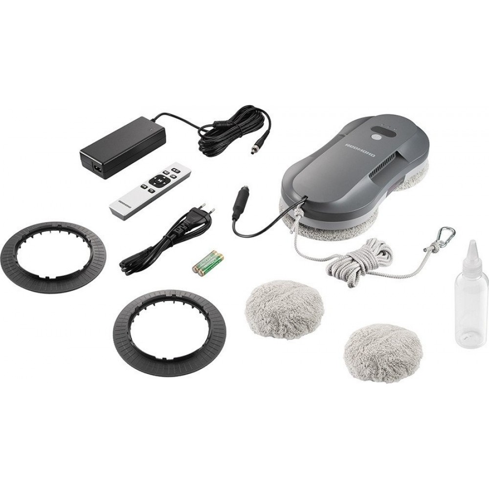 Комплектация: робот-мойщик оконсетевой адаптерсетевой шнурудлинитель сетевого шнурапульт дистанционного управлениястраховочный трос с карабиномруководство по эксплуатациисервисная книжкаэлемент питания R03 (AAA) (2 шт.)флакон для наполнения резервуара для водыcъемные кольца для мопов (4 шт.)мопы из микрофибры (6 шт.)
