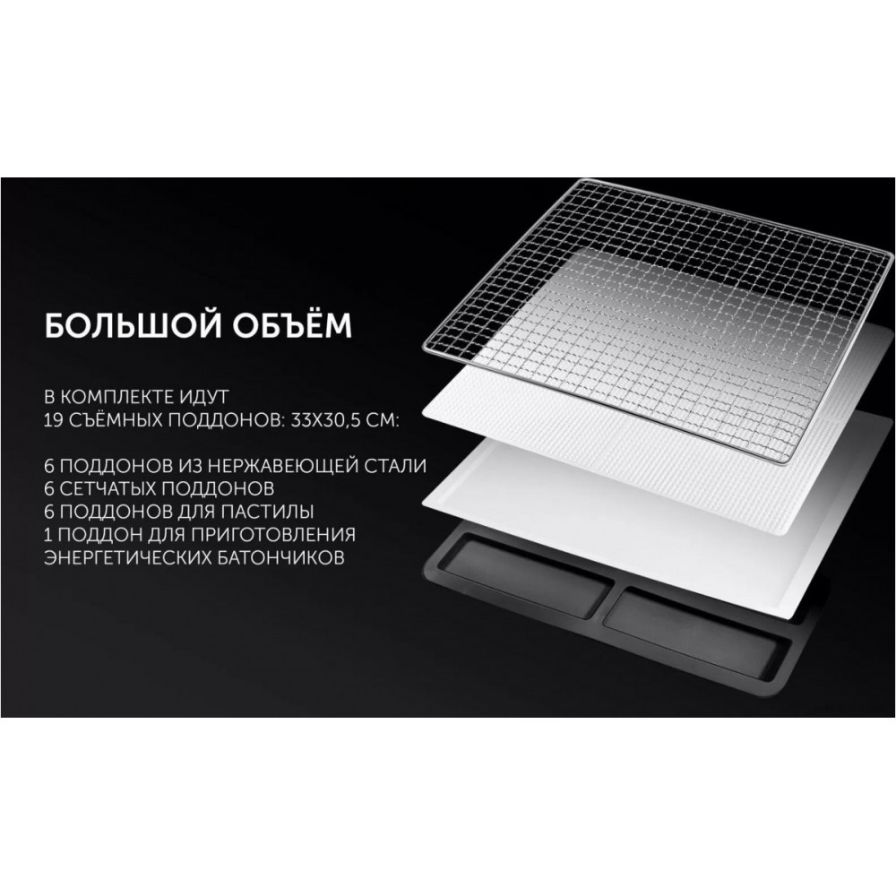 Комплектация: 19 поддонов c размерами 33x30,5 см;- 6 поддонов из нержавеющей стали- 6 гибких сетчатых листов- 6 гибких поддонов для пастилы- 1 поддон для приготовления энергетических батончиков
