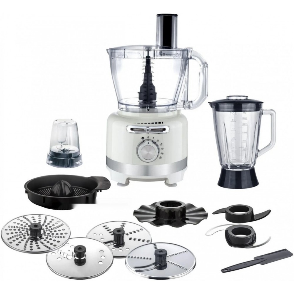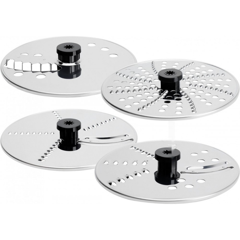 Комплектация: • Моторное основание; • Чаша измельчителя; • Толкатель; • Длинный вал; • Короткий вал; • Блендер с крышкой; • Диск эмульгатор; • Нож для измельчения; • Нож для теста; • Лопатка; • Диск – 4 шт (лезвие для нарезки картофеля фри; двухстороннее лезвие для крупной шинковки – диск-жюльен; двухстороннее лезвие для мелкой шинковки – диск-жюльен; терка для драников); • Соковыжималка; • Кофемолка; • Руководство пользователя;
