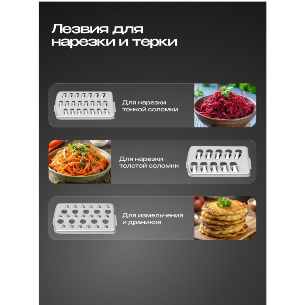 Функции: измельчитель, шинковка, драники, терка, ломтерезка